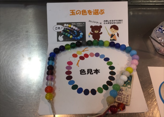 小さなお子さんには、アクセサリー制作体験がおすすめ。こちらは、工房にあるとんぼ玉を選んで、ネックレスやキーホルダーを作ります。料金は、選んだとんぼ玉の価格(800円〜)とパーツ代が必要です。