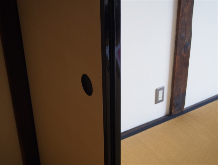 2階部分も1階部分と同じように開放されています。1階と同じく屋根が低く、圧迫感を感じます。個人的に気になったのが、ふすまのこの部分。光沢があり、テカテカと光っているのです。何か特別なコーティングがされているのでしょうか。