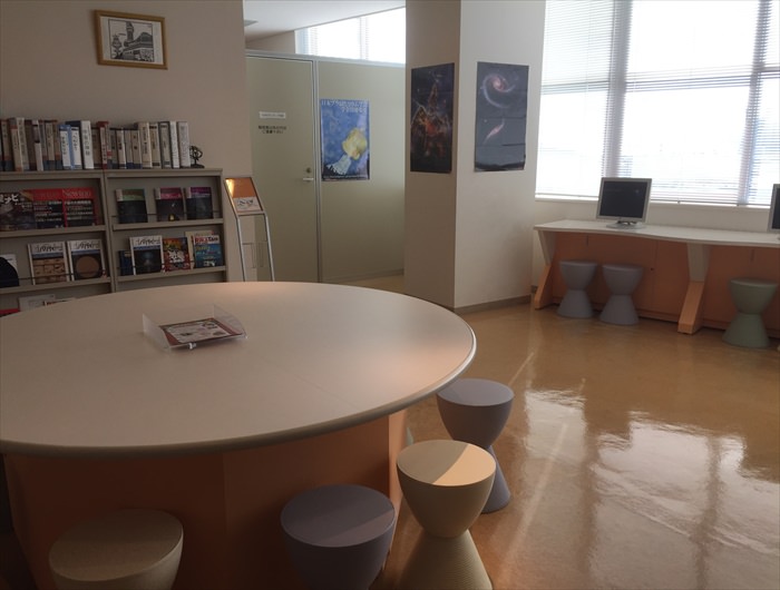 ここは「天文サロン」です。テーブルや天文情報を検索できる装置、天文や科学に関する本や雑誌がずらりと並んでいるエリア。写真左側にトイレがあって、少し休憩する場所にはちょうど良いスペースですね。