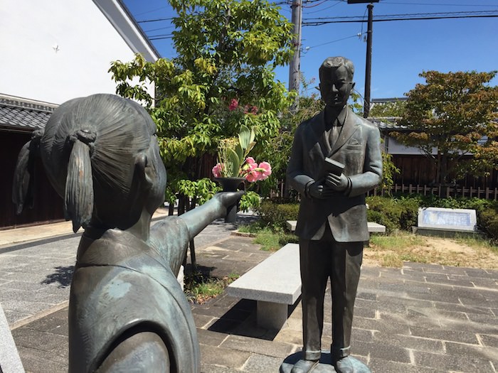 メンターム資料館のみどころはやはり「ヴォーリズの少女の像」。髪を2つに縛った着物姿の少女がヴォーリズ氏に向かって花束を渡しているシーンがそのまま銅像になっています。