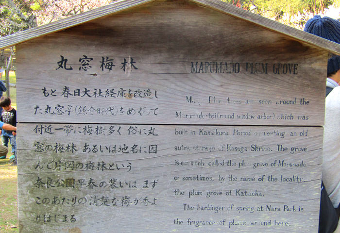 梅林内に立てられている木製の看板によると、「もと春日大社経庫を改造した丸窓亭(鎌倉時代)をめぐって付近一帯に梅樹多く 俗に丸窓梅林 あるいは地名に因んで片岡の梅林という奈良公園の早春の装いは