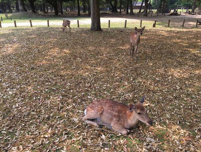 こんな感じで人を怖がることなく鹿があちこちでのんびりと寝そべっているんです。奈良公園に入ると、あちこちにまとまった数の鹿がうろうろとしているから、まるで鹿の世界へ迷い込んでしまったかのよう。