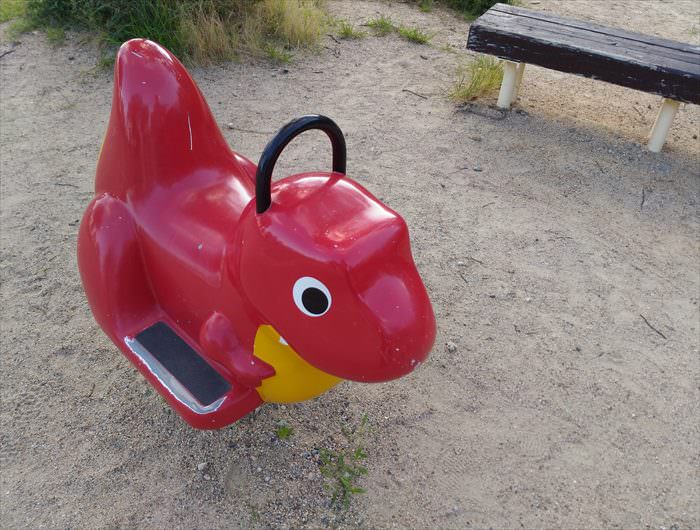 2体の恐竜の乗り物遊具です。幼児向けの遊具の定番といったところですね。3〜6歳の幼児は大人が付き添うようにとの指示が書かれていました。