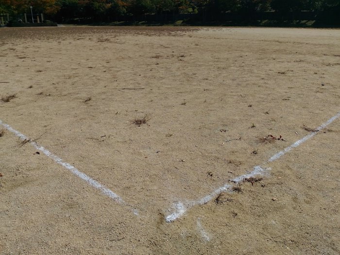 誰かがひいた白線が残っていました。まずはこのグラウンドで楽しみたいのは野球じゃないでしょうか。本格的なゲームを行うことができるスペースが用意されていますよ。